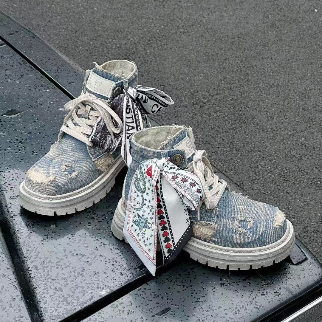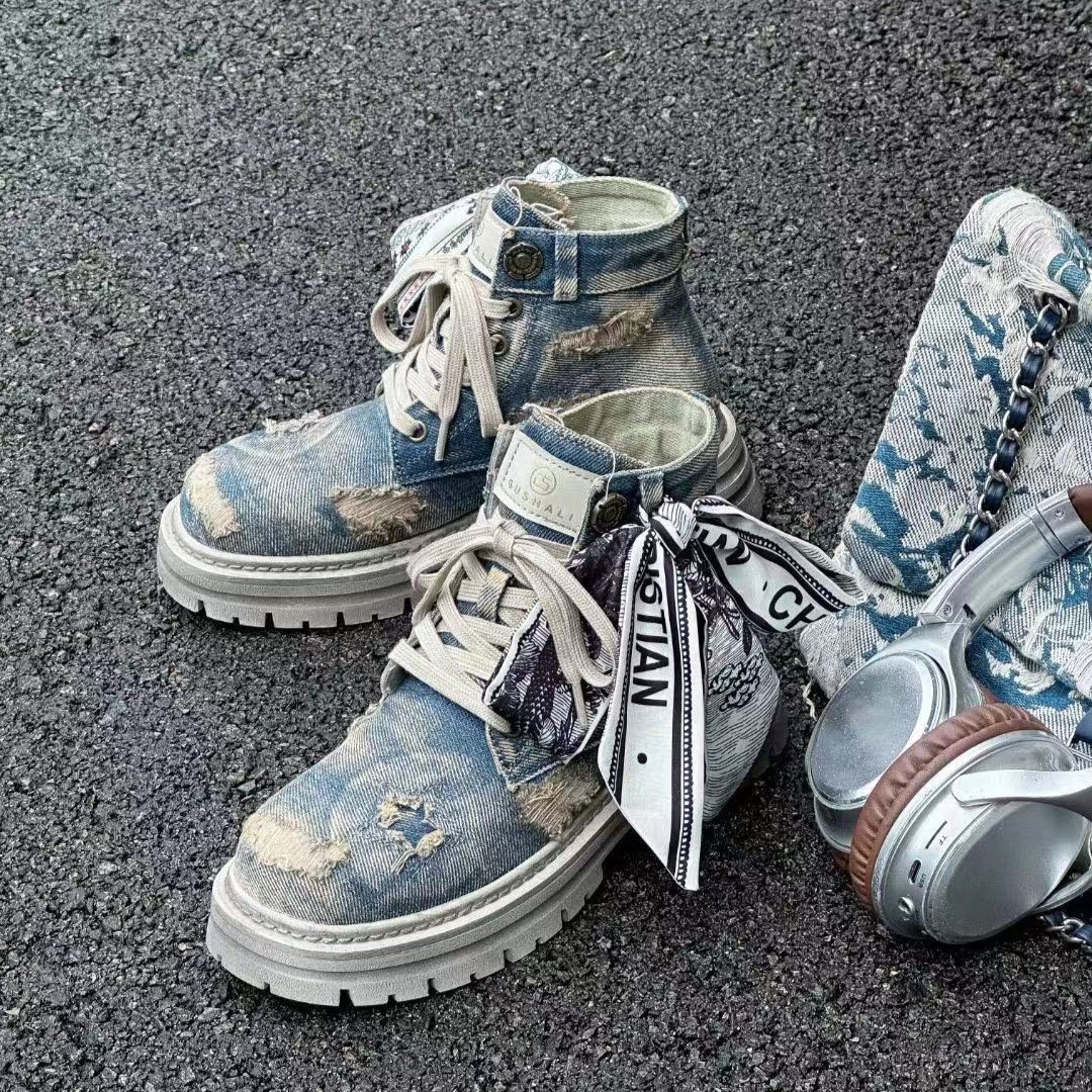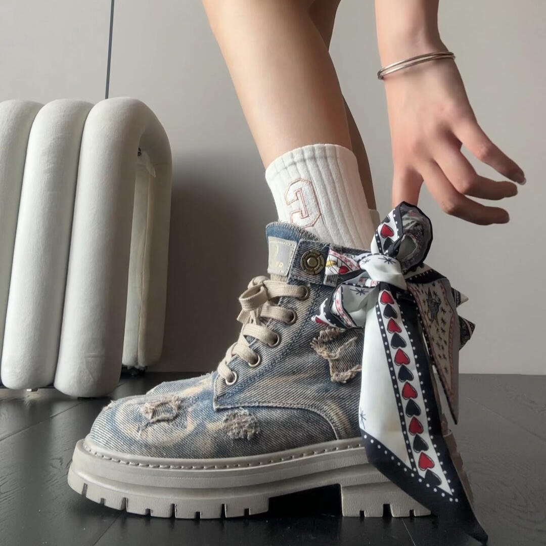 Channel your inner rockstar with our Retro Ripped Denim Boots & Scarf set! These distressed boots boast vintage vibes, while the cozy scarf adds a touch of boho chic. Pair with a band tee and hit the town, or dress them down for a day of festival fun.