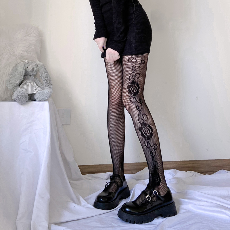 Side Black Rose Fishnet Pantyhose Stockings Tights
