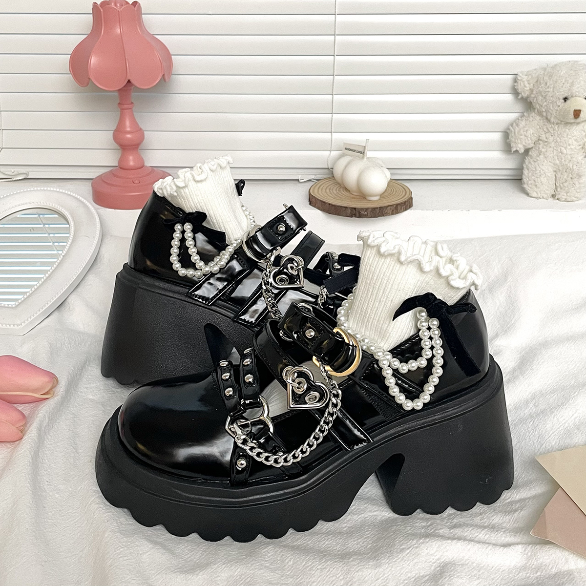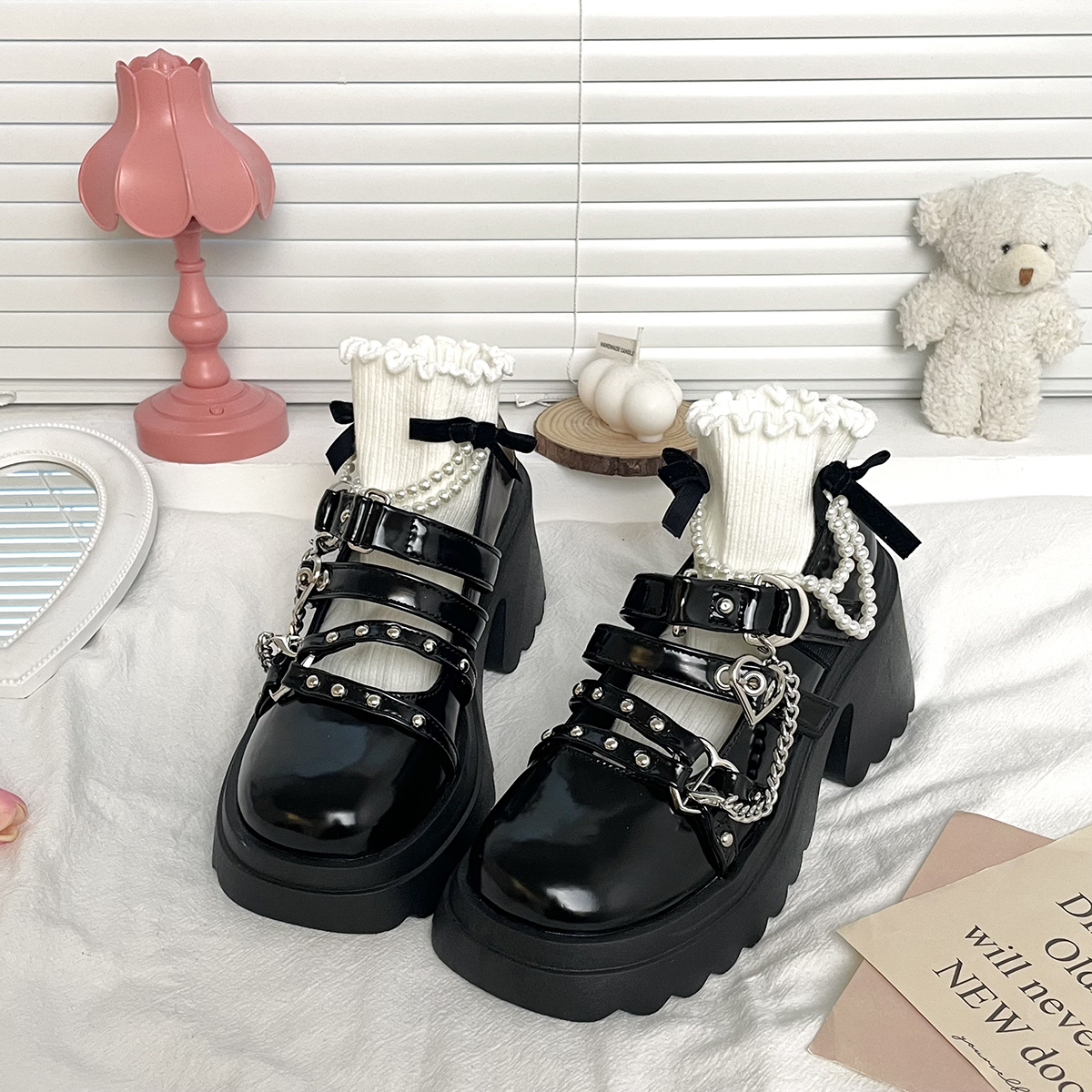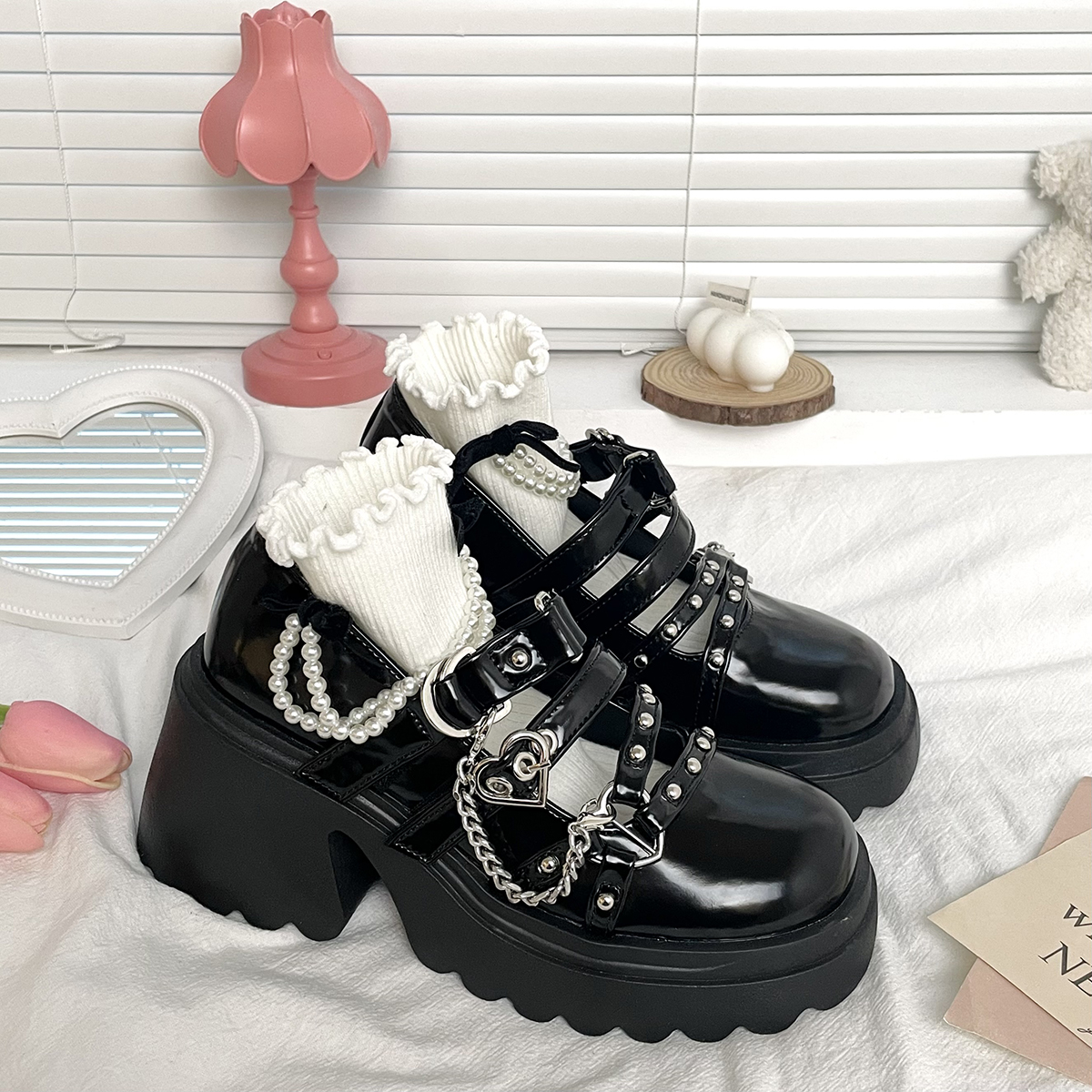 Metal Heart Buckle Chunky Heels Leather Shoes
