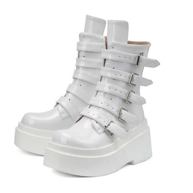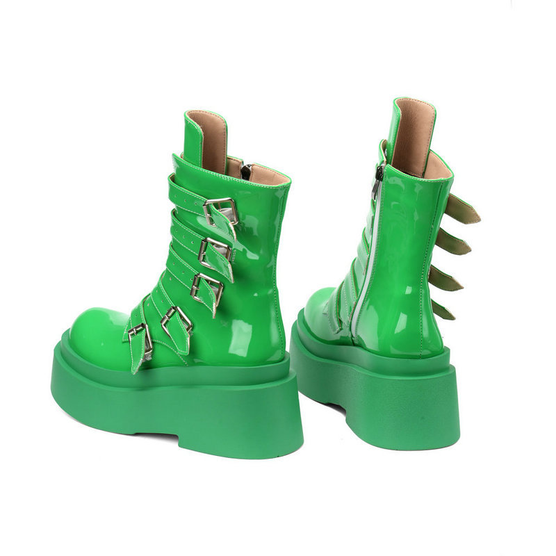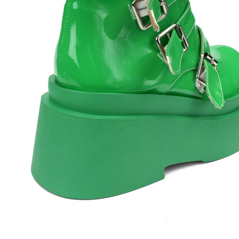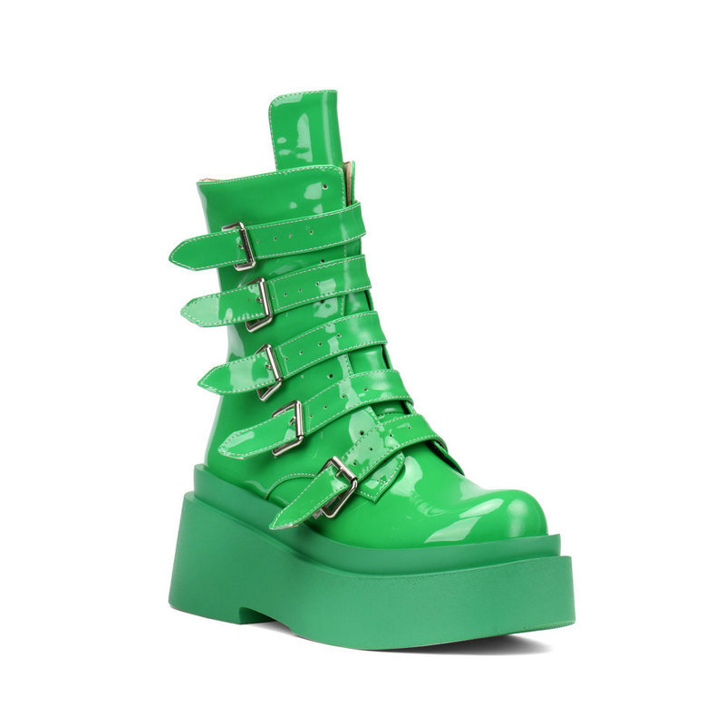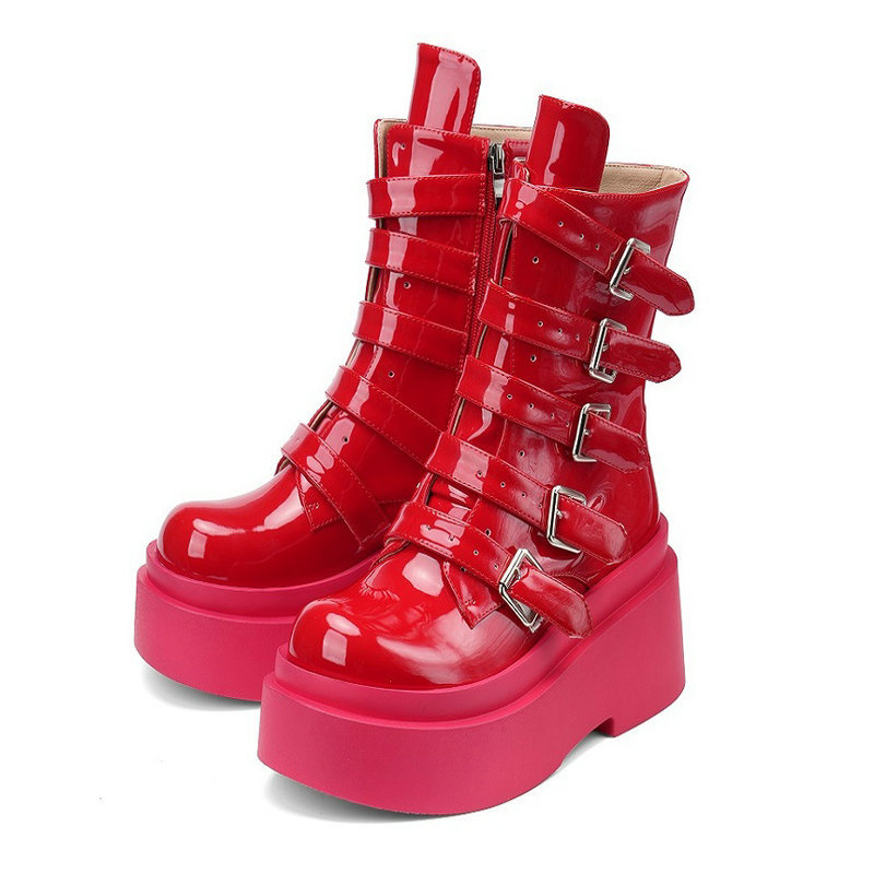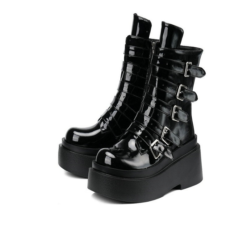 Crafted from glossy patent leather material, these boots exude a sleek and distinctive appeal. The patent finish not only adds a touch of sophistication but also provides durability and resistance to wear and tear. With these boots, you can confidently step out with an air of confidence and attitude.