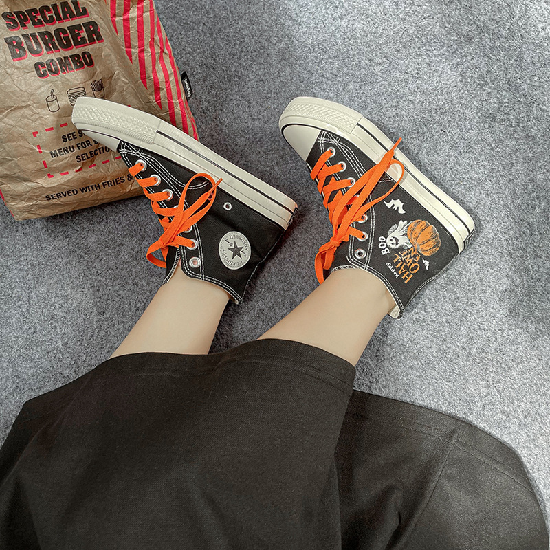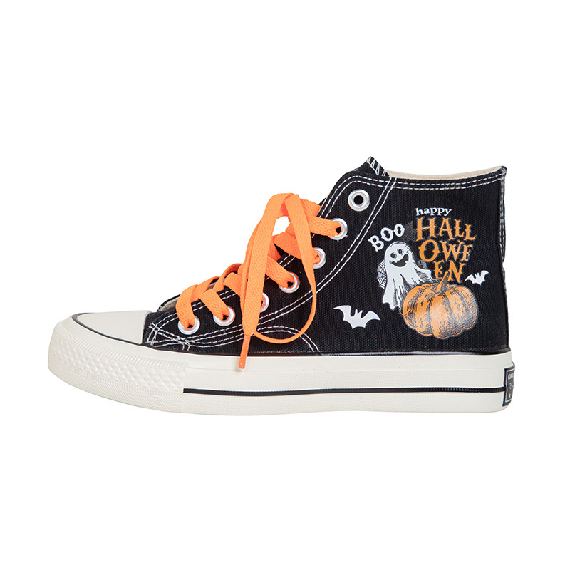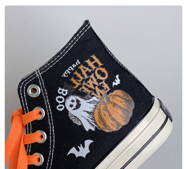 Hand-painted Halloween Canvas Shoes are the ideal footwear for celebrating the spooky season in style. These shoes are made of high-quality canvas material that is soft, comfortable, and durable. The shoes feature a hand-painted design of a pumpkin and a bat on the side, giving them a unique and festive look. The shoes also have a lace up design and a rubber sole that is anti-slip and wear-resistant. Whether you are going to a Halloween party, trick-or-treating, or just enjoying the autumn vibes, these shoes will add some fun and flair to your outfit. Hand-painted Halloween Canvas Shoes are in classic black color. Order yours today and get ready to rock the Halloween season with these awesome shoes!