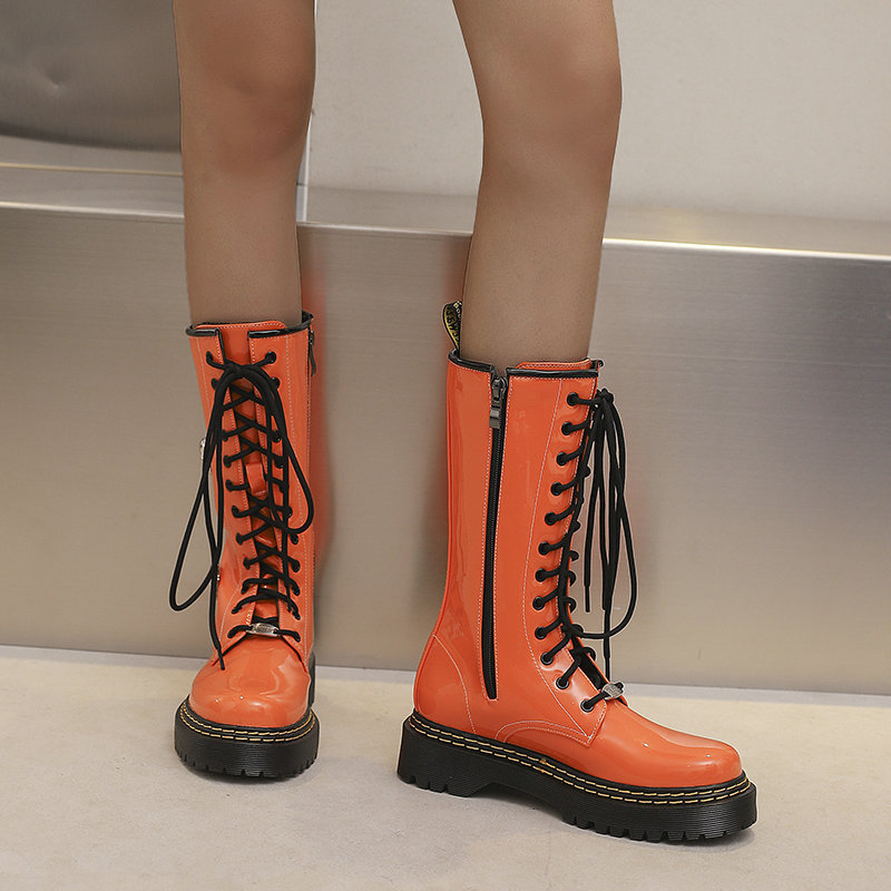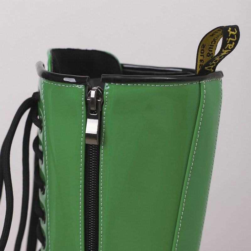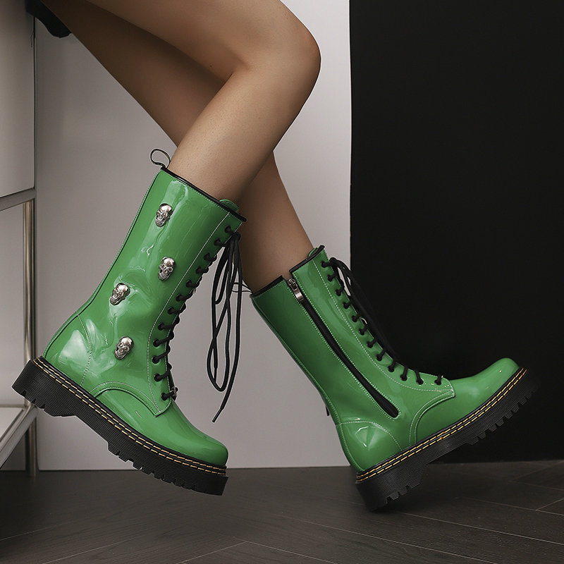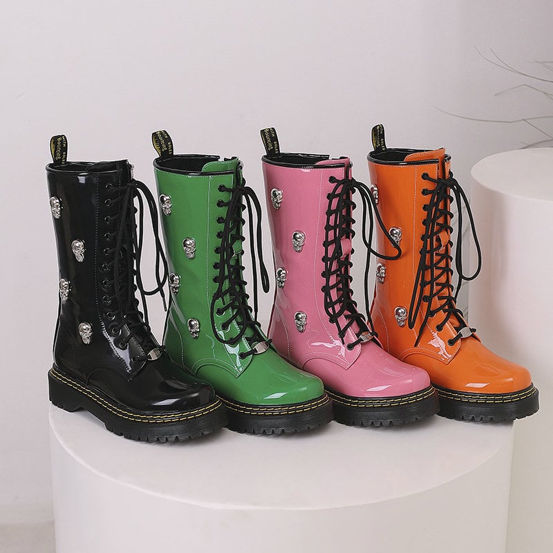 Skull Patent Leather Lace Up Boots are a cool and unique choice for any occasion. These boots feature a glossy patent leather material, a front lace-up design, and a midtube height. They also have metal skull decor on the sides, giving them a rebellious and edgy vibe. They come in four different colors: green, black, pink, and orange. You can choose the one that suits your personality and style.