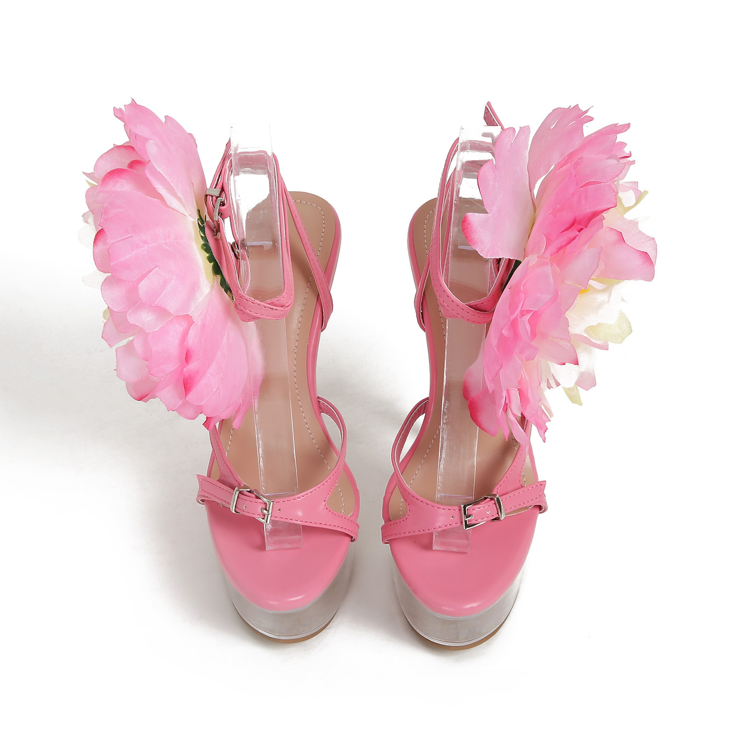 Fashion Cross Strap Crystal Transparent Heeled Sandals With Big Flower Detail
