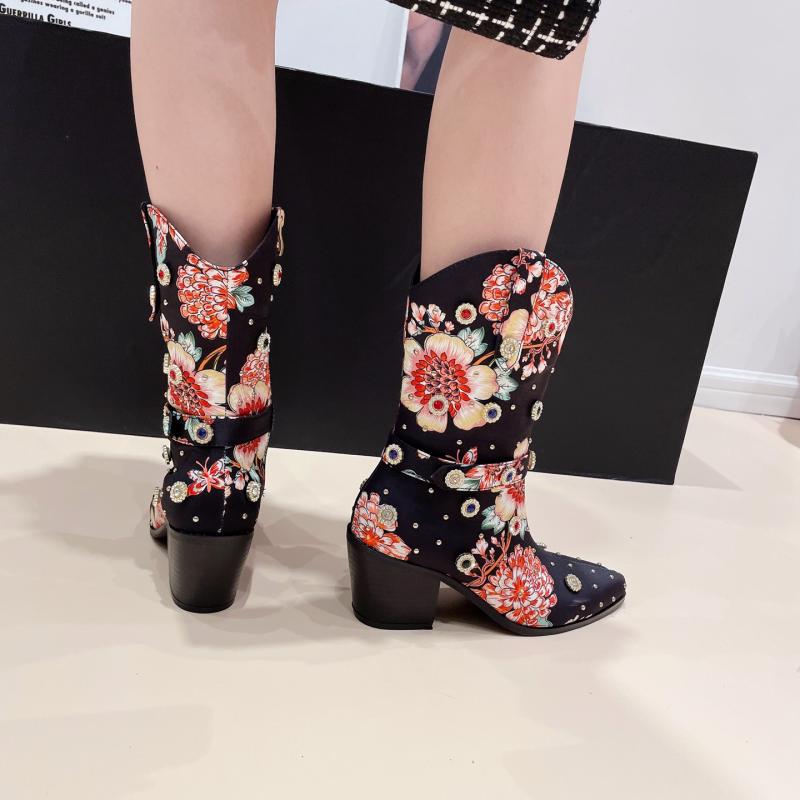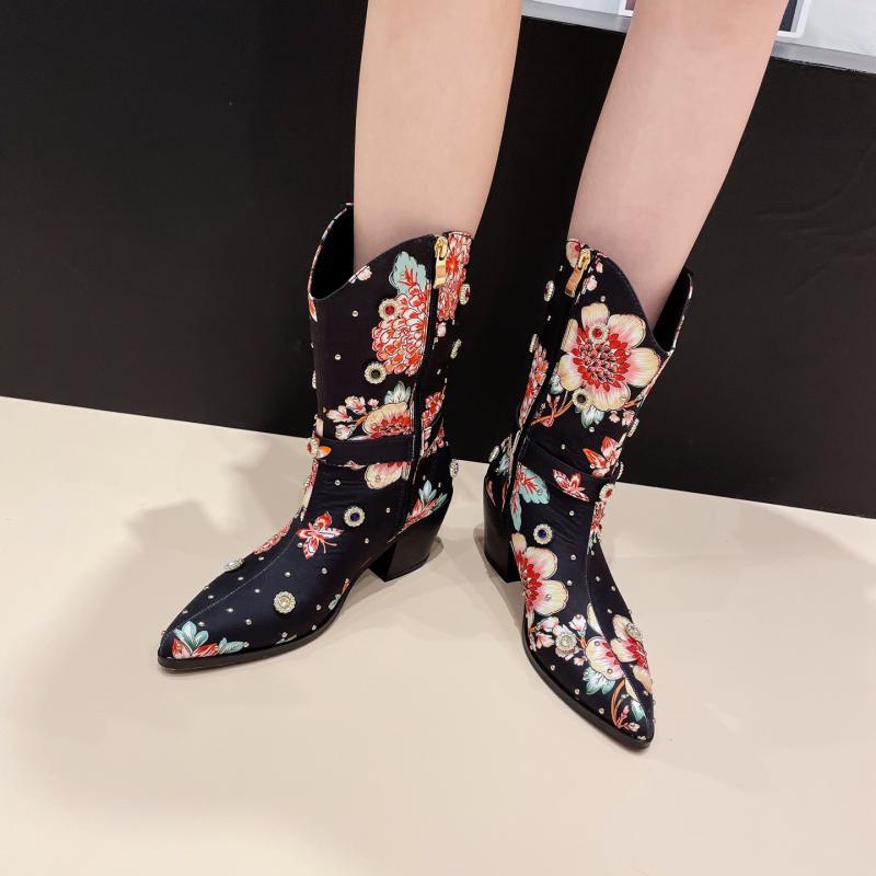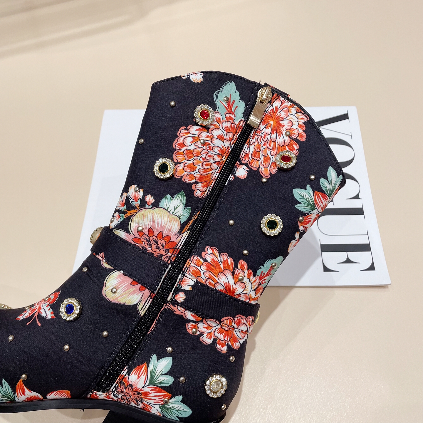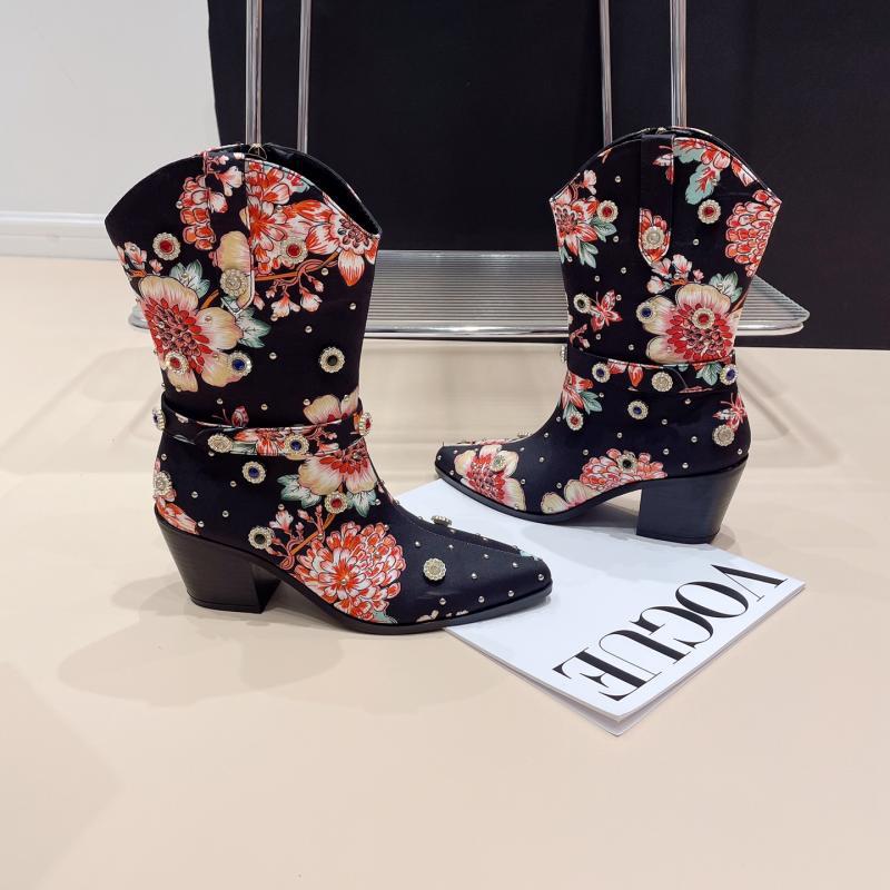 Introducing our Vintage Floral Boots – a perfect blend of cowboy charm and feminine allure. With an all-over floral print, rhinestone rivets, and a pointed toe, these boots exude a classic Western vibe with a touch of vintage elegance. Perfect for any occasion, they pair seamlessly with jeans, dresses, or skirts. Step into timeless style and let your footwear make a statement. Own a piece of vintage-inspired art for your feet – order now and bloom with every step.