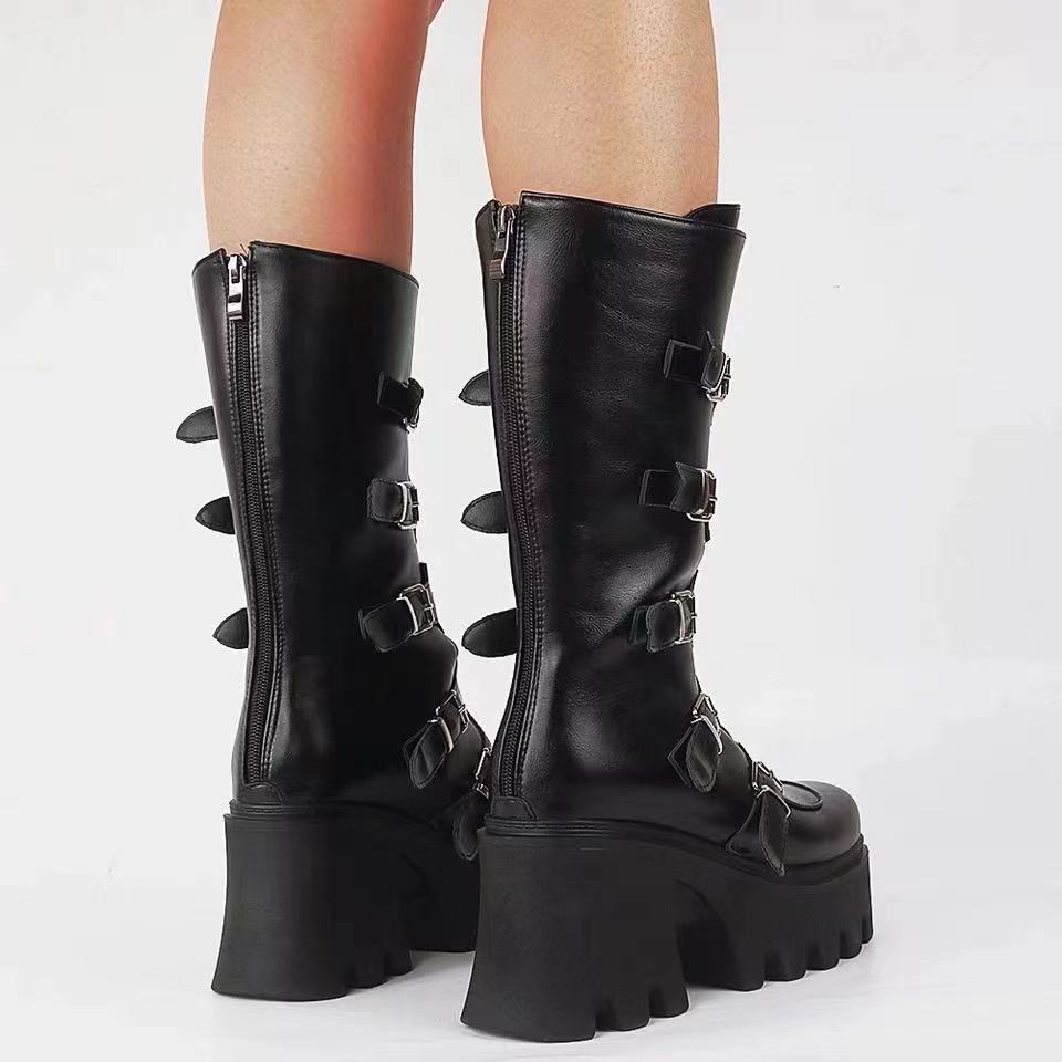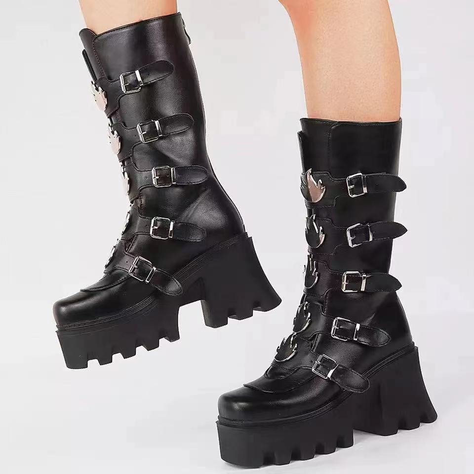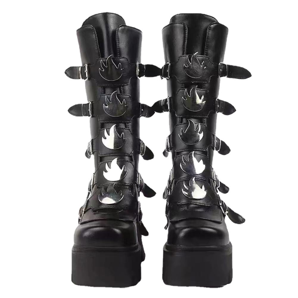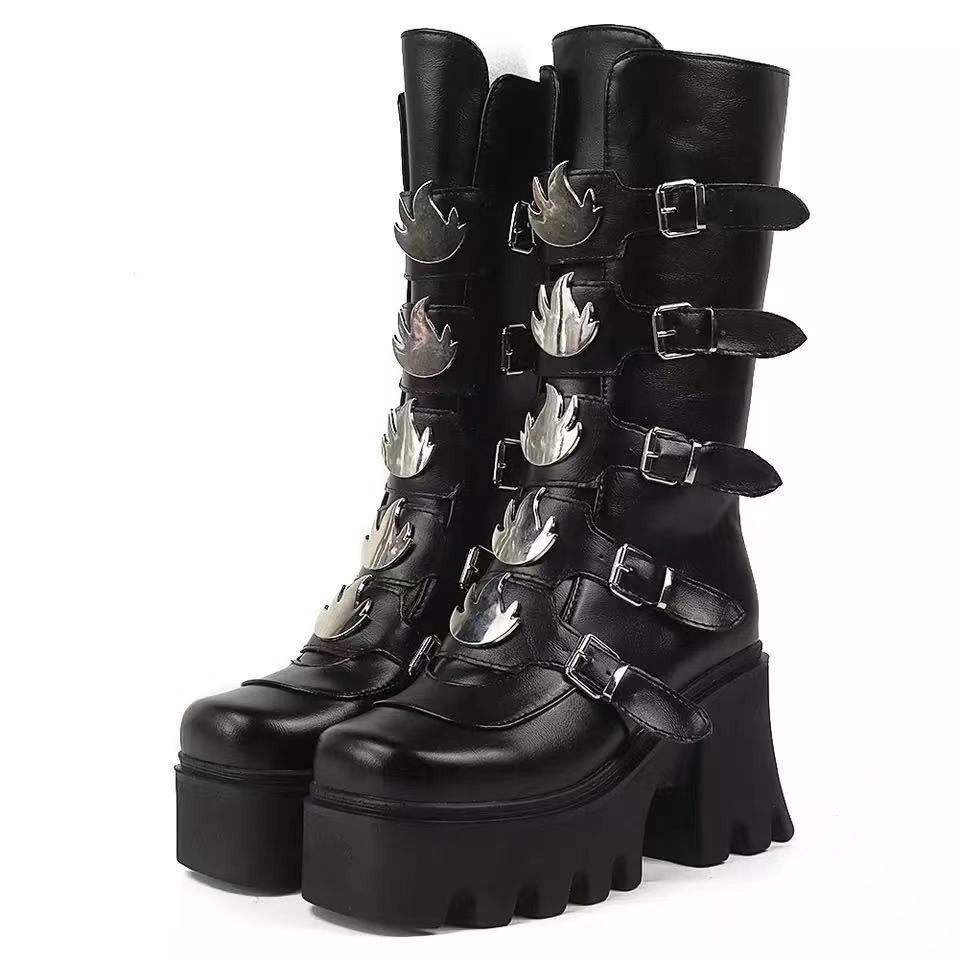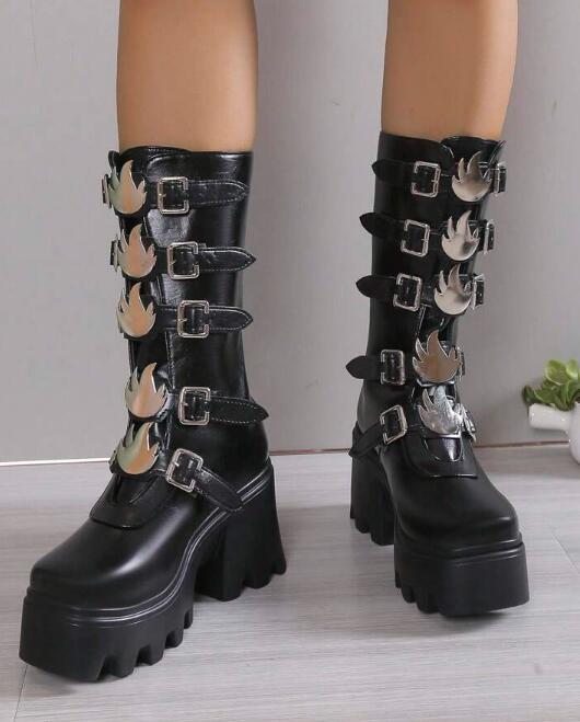 Grunge Punk Women Fire Buckle Decor Platform Chunky Heeled Boots