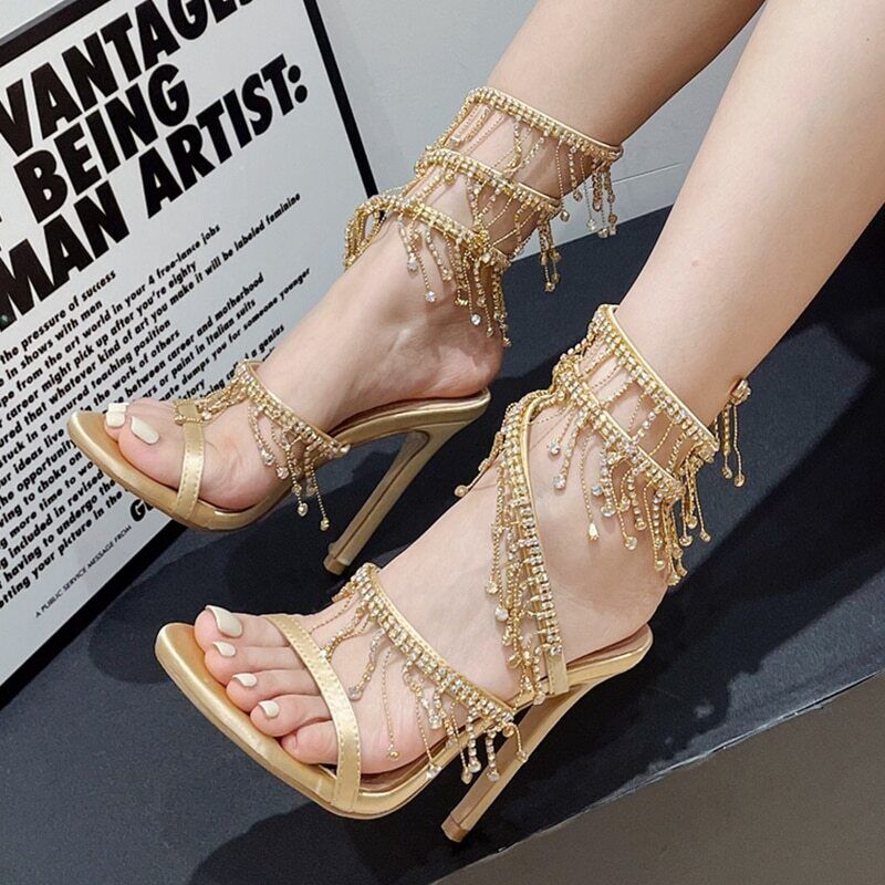 Sparkle and shine in our Rhinestone Open Toe Cross Strap Party Shoes Stiletto High Heels Sandals! These dazzling sandals are perfect for any special occasion, from weddings to proms to cocktail parties.