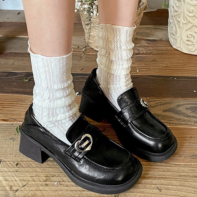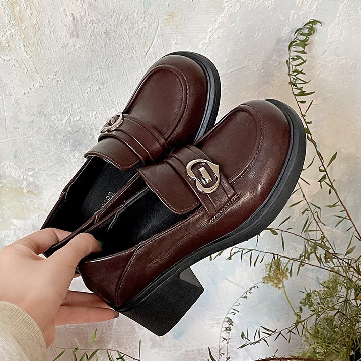 These stylish shoes boast a classic silhouette with a modern twist, featuring a heart-shaped buckle for a touch of playful romance. The comfortable heel adds a touch of sophistication while maintaining easy wearability. Crafted with attention to detail, these loafers are perfect for pairing with jeans, skirts, or dresses, making them a versatile addition to your wardrobe. Embrace the timeless appeal of these Retro Heart Buckle Heeled Loafers and elevate your everyday style.