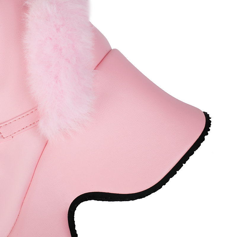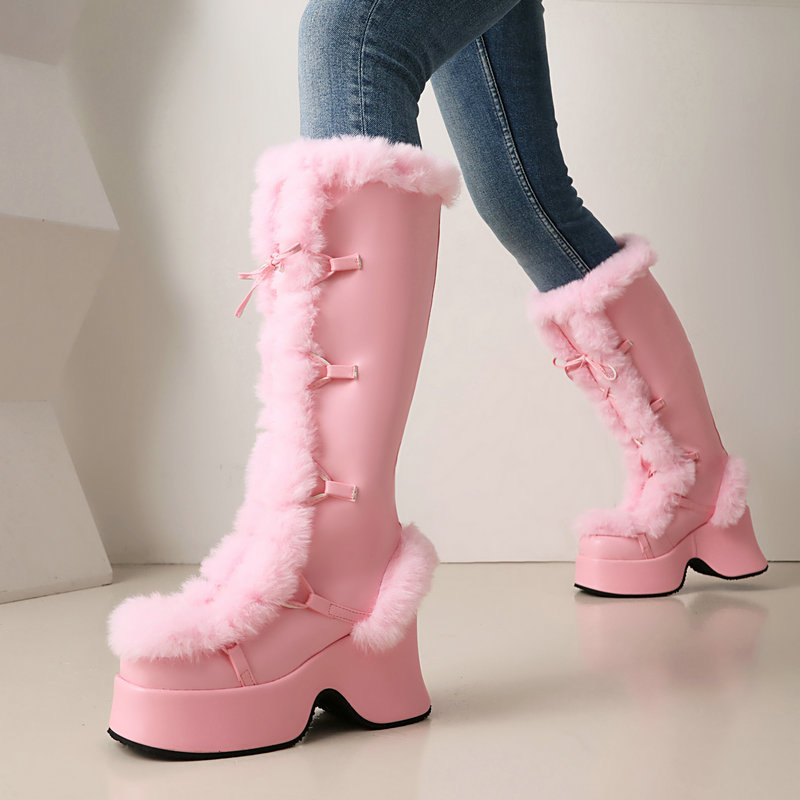 Furry Fur Lace Up Platform Knee Hight Boots In PINK