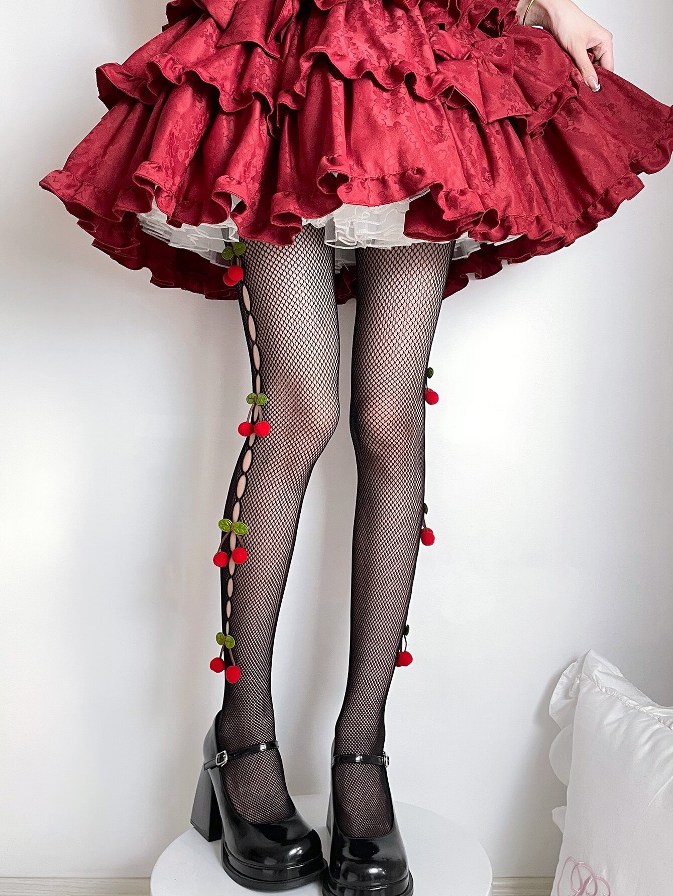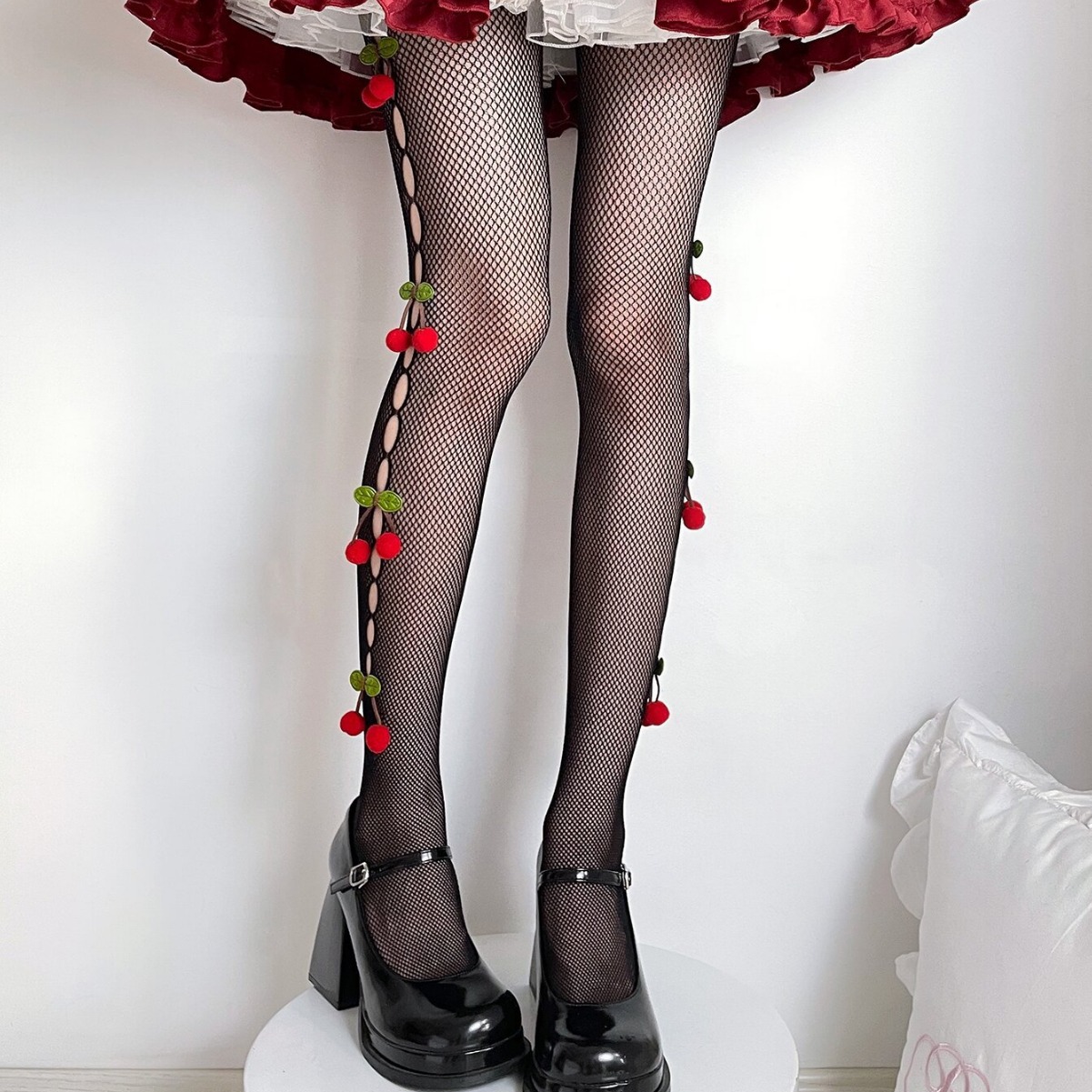 Add playful charm to your outfit with our Sweet Cherry Fishnet Pantyhose. These flirty tights feature delicate cherry details running along the sides, adding a pop of sweetness to the classic fishnet design. Perfect for adding a fun, bold twist to dresses, skirts, or even edgy streetwear looks. Soft, stretchy, and designed for comfort, these stockings hug your legs with a flattering fit while making a cheeky style statement. Whether for a night out or everyday flair, these cherry-accented tights are your go-to for effortless confidence and standout vibes.