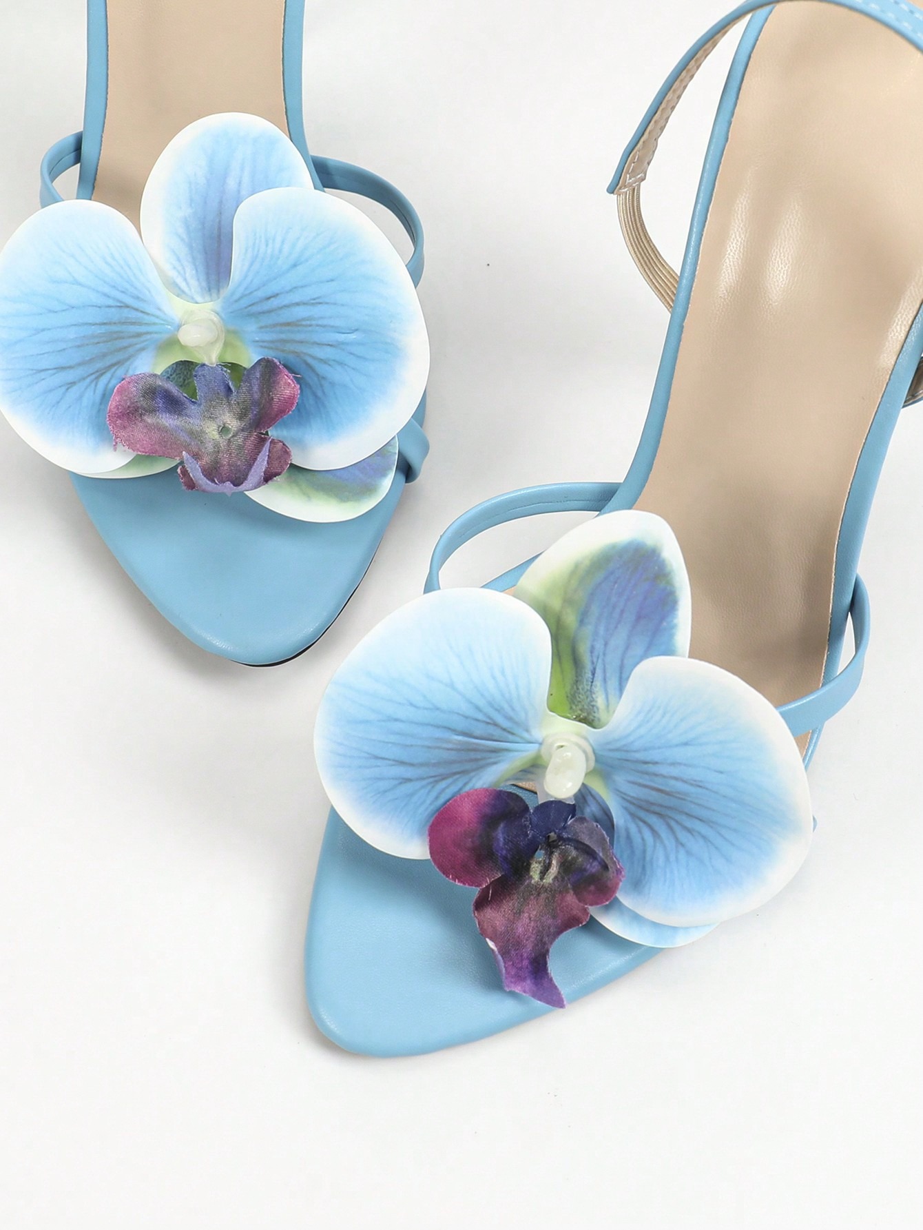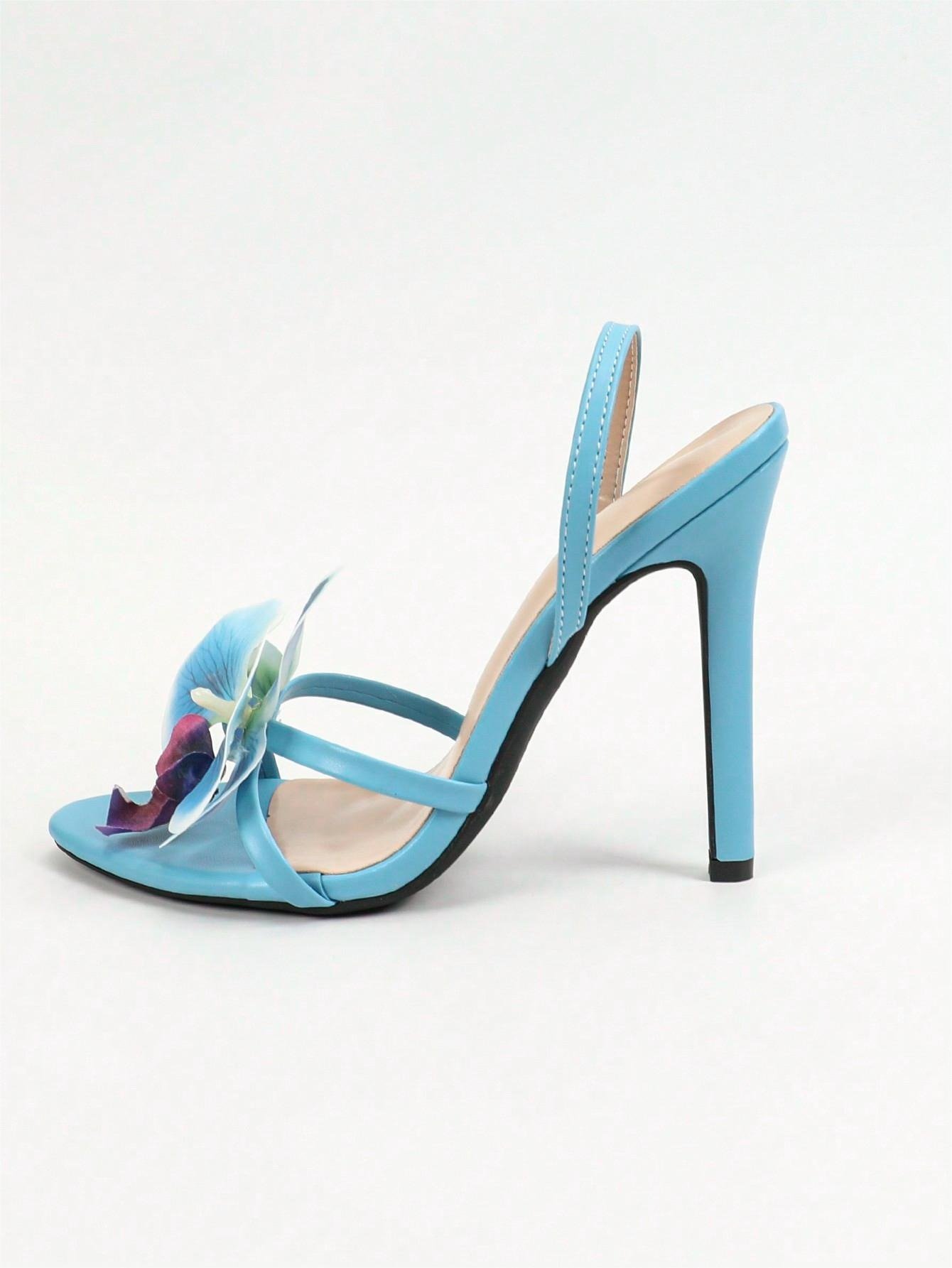 Blue Floral Strappy High Heels Sandals. Featuring an exquisite floral pattern on a vibrant blue backdrop, these sandals are designed to make a statement. The delicate strappy design elegantly wraps around your foot, providing both support and undeniable sophistication. Perfect for garden parties, summer weddings, or adding a touch of feminine charm to any outfit. Walk with confidence and grace.