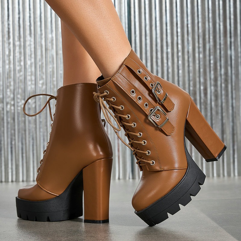 Make a statement with these chic belted lace-up high-heel ankle boots. Designed for the fashion-forward, they combine edgy appeal with sophisticated charm. The adjustable belt detail adds a unique touch, while the secure lace-up front ensures a perfect fit. Crafted with a comfortable high heel, these boots are perfect for elevating any outfit, from casual jeans to a night-out dress. Step out in confidence and style!