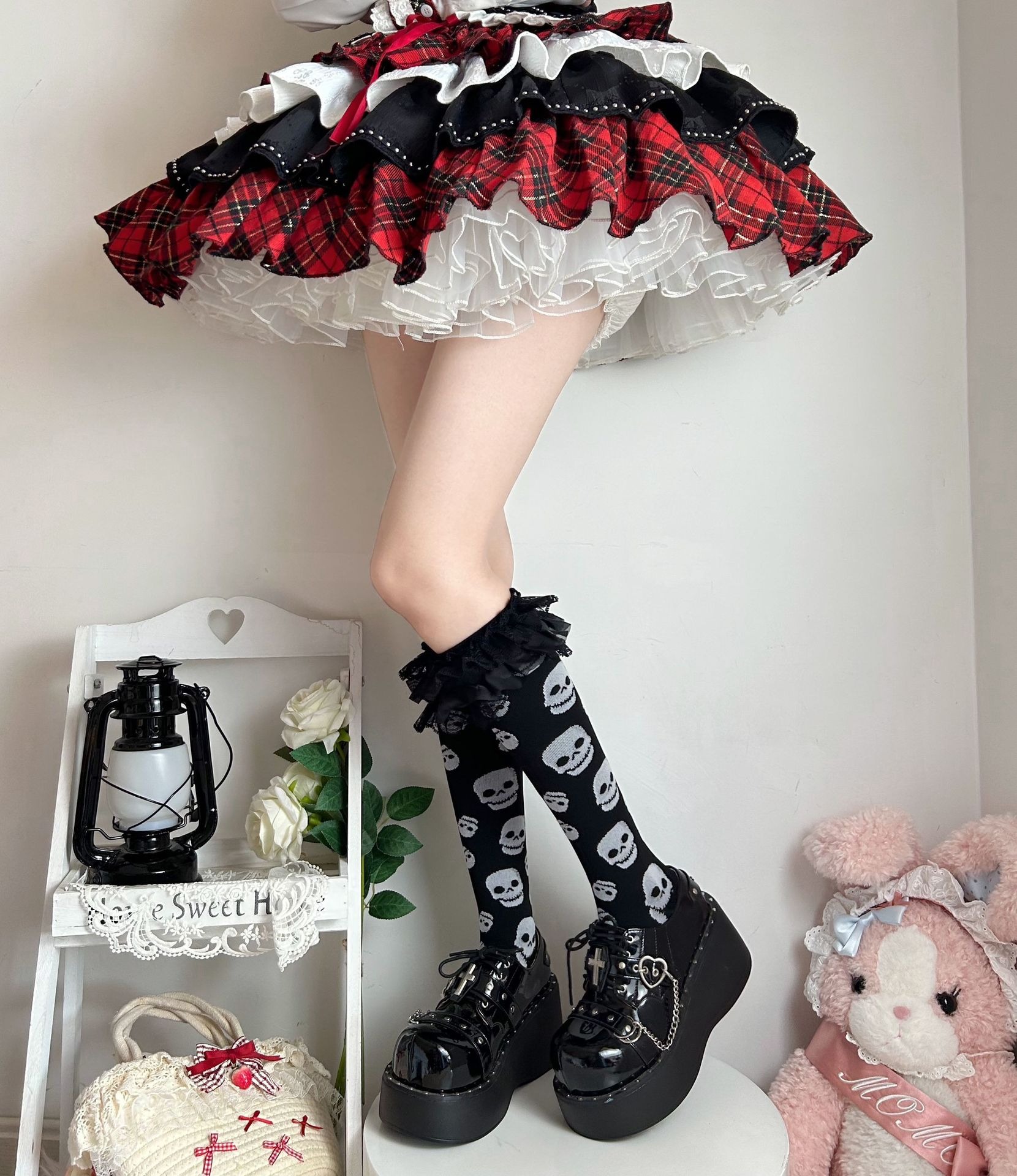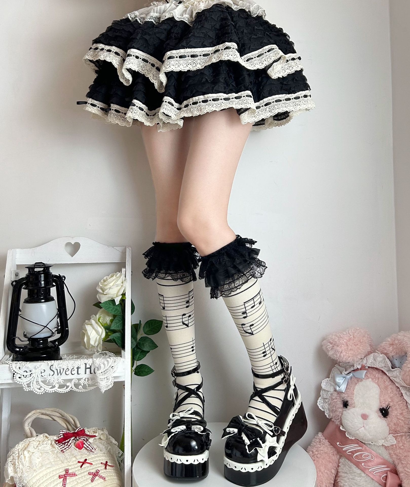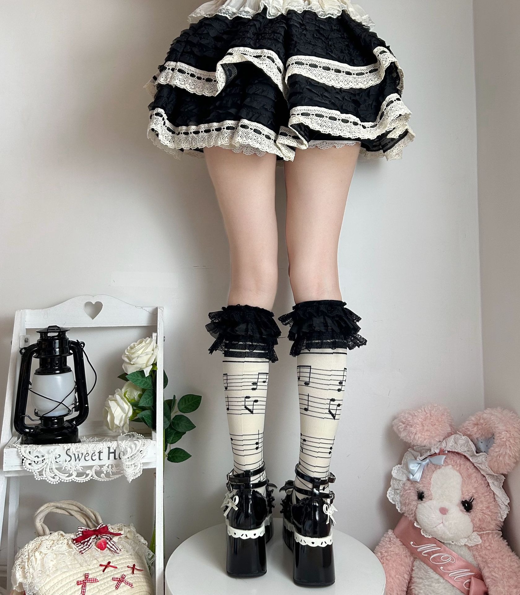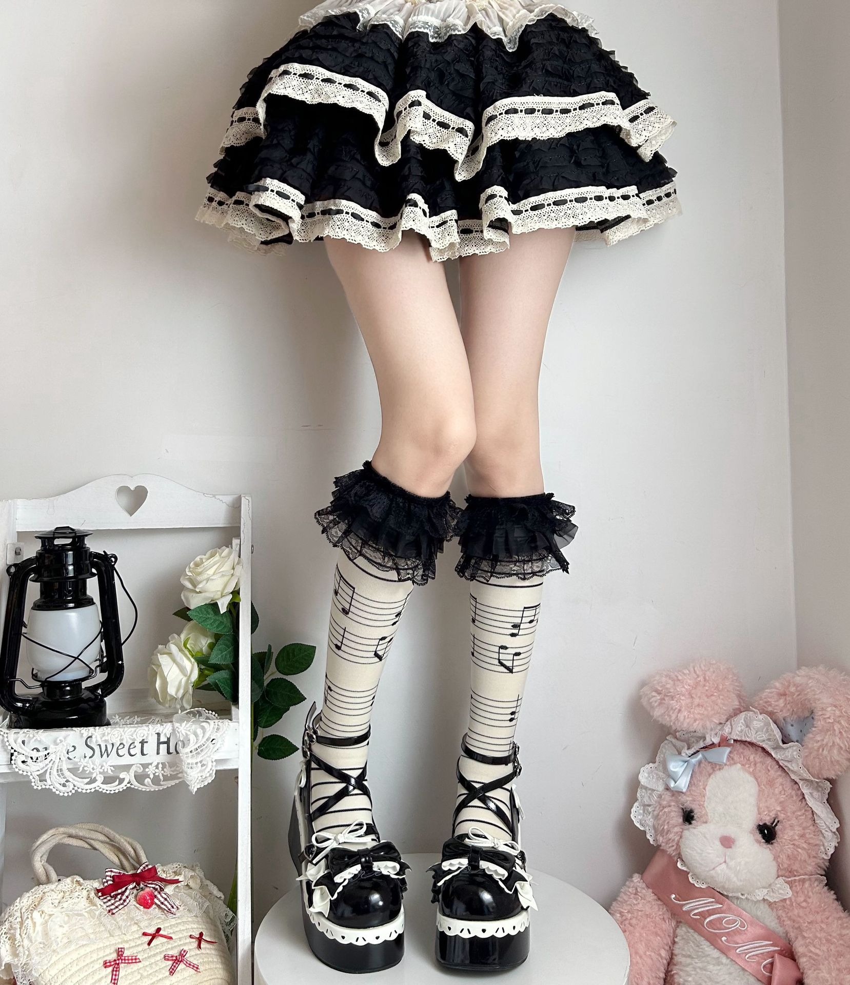 These unique socks combine gothic charm with playful flair, featuring a cool skull and music note design alongside delicate ruffles. Made from a soft, comfortable blend, they're perfect for adding a rebellious yet sweet touch to your outfit. Whether you're hitting a concert or just expressing your individuality, these long socks are a must-have for anyone who loves alternative fashion.