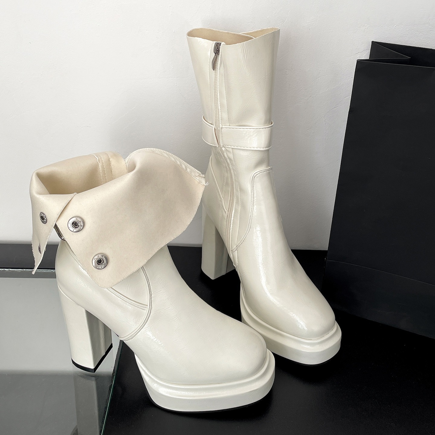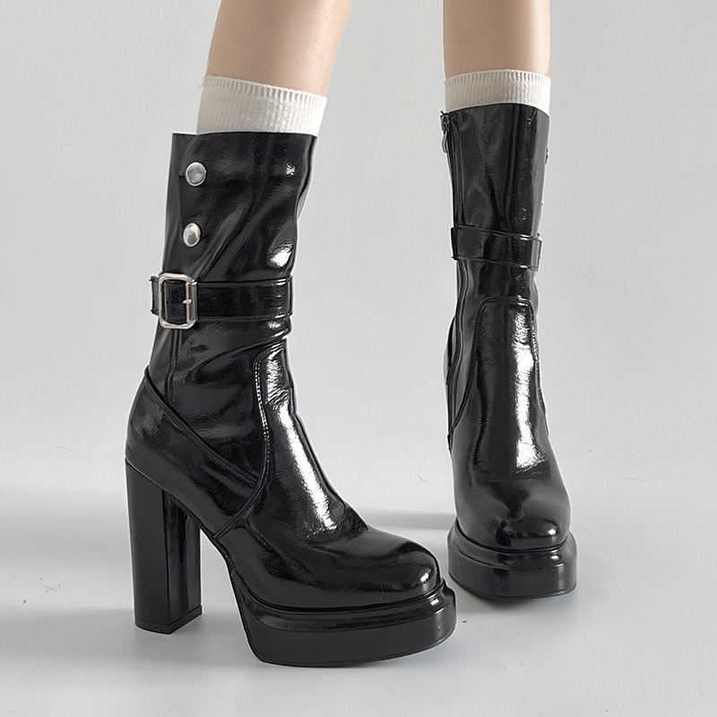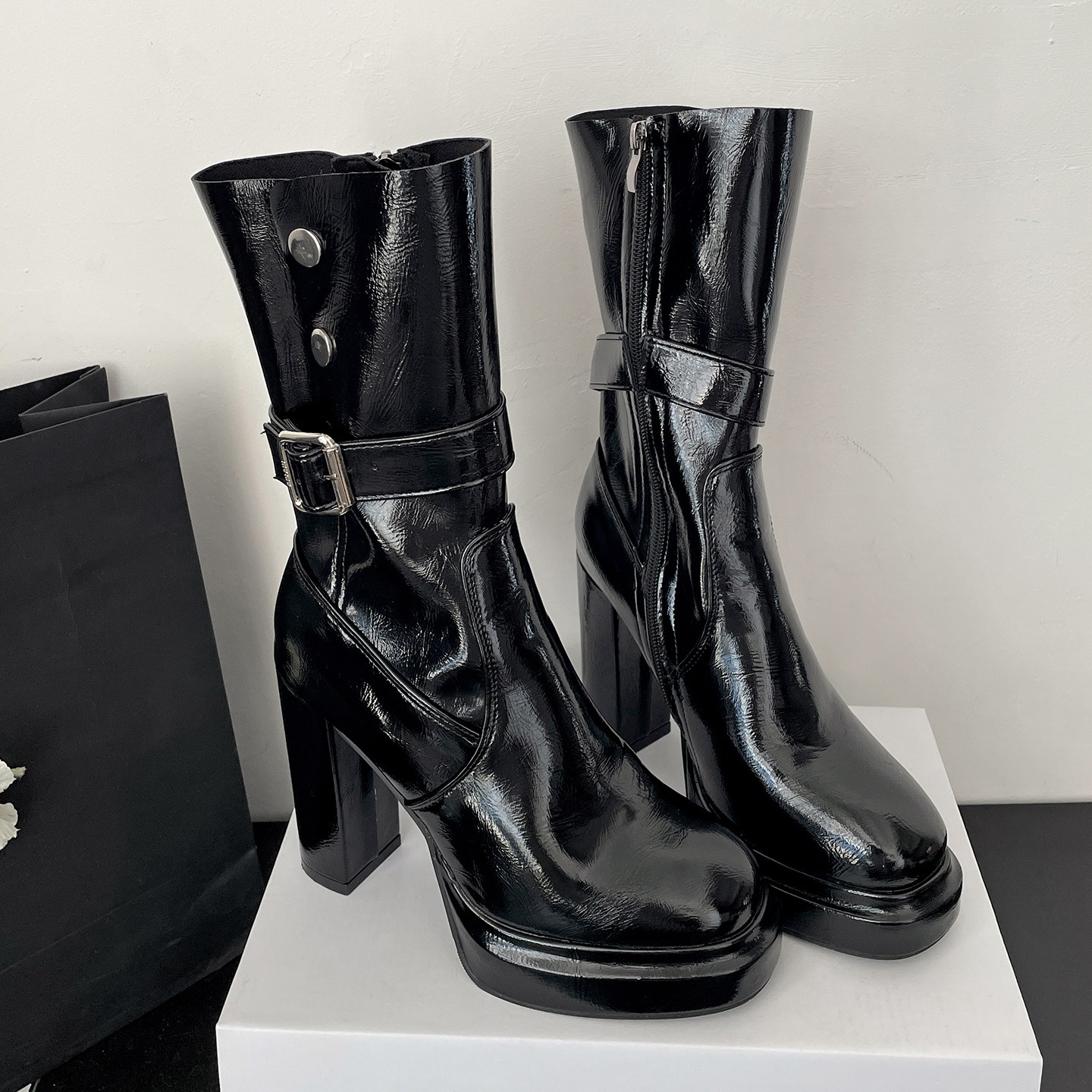 These boots are a modern take on a classic silhouette, featuring a glossy patent finish that catches the light with every step. The bold buckles add an edgy detail, while the chunky heel provides both a fashionable lift and stable support. Perfect for elevating your look from day to night, these boots are an essential addition to any trendsetter's wardrobe.
