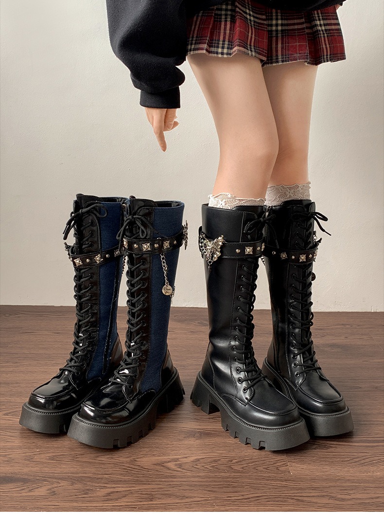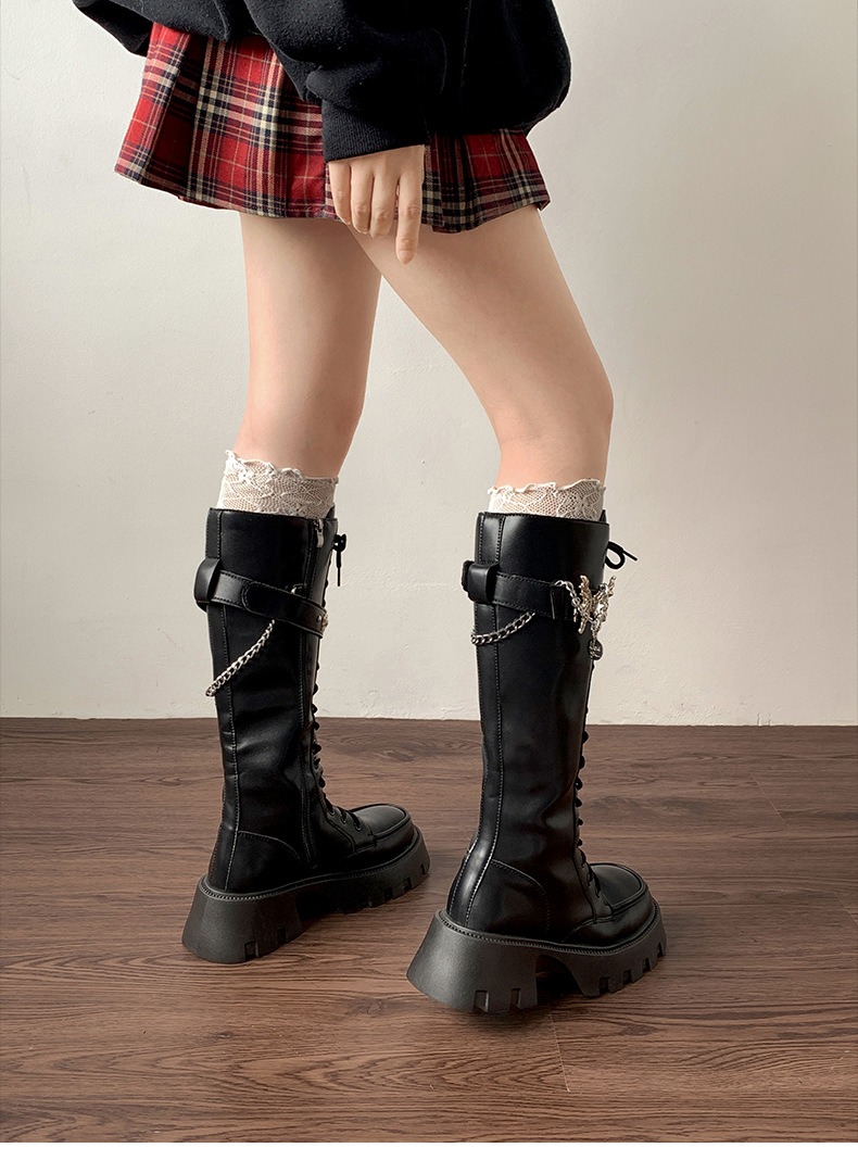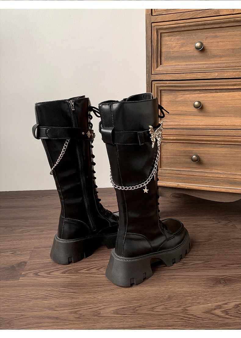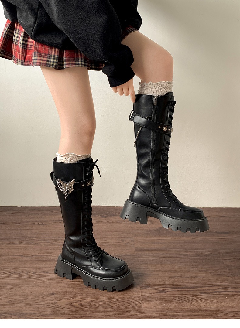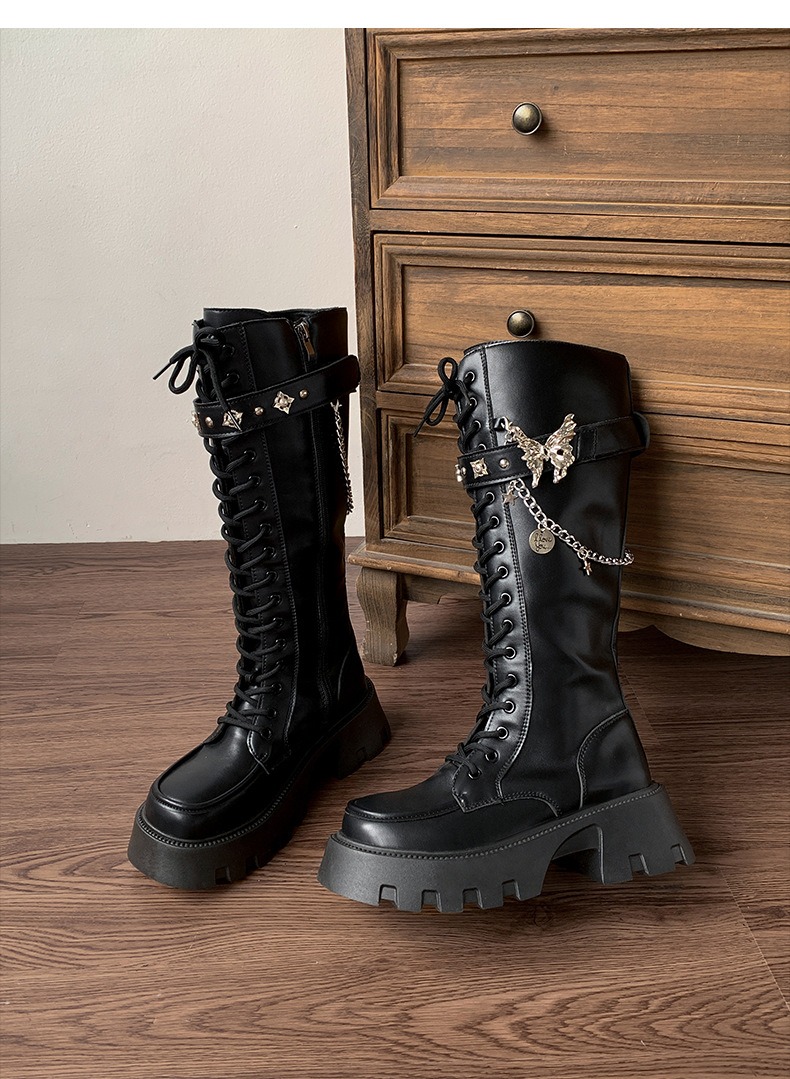 These stunning boots feature a bold, front lace-up design that offers a custom fit and fierce look. A detachable belt, adorned with intricate metal butterfly decor, adds a touch of delicate elegance to the edgy silhouette. Made for making a statement, these boots are the perfect blend of sweet and rebellious, ensuring you turn heads with every step.